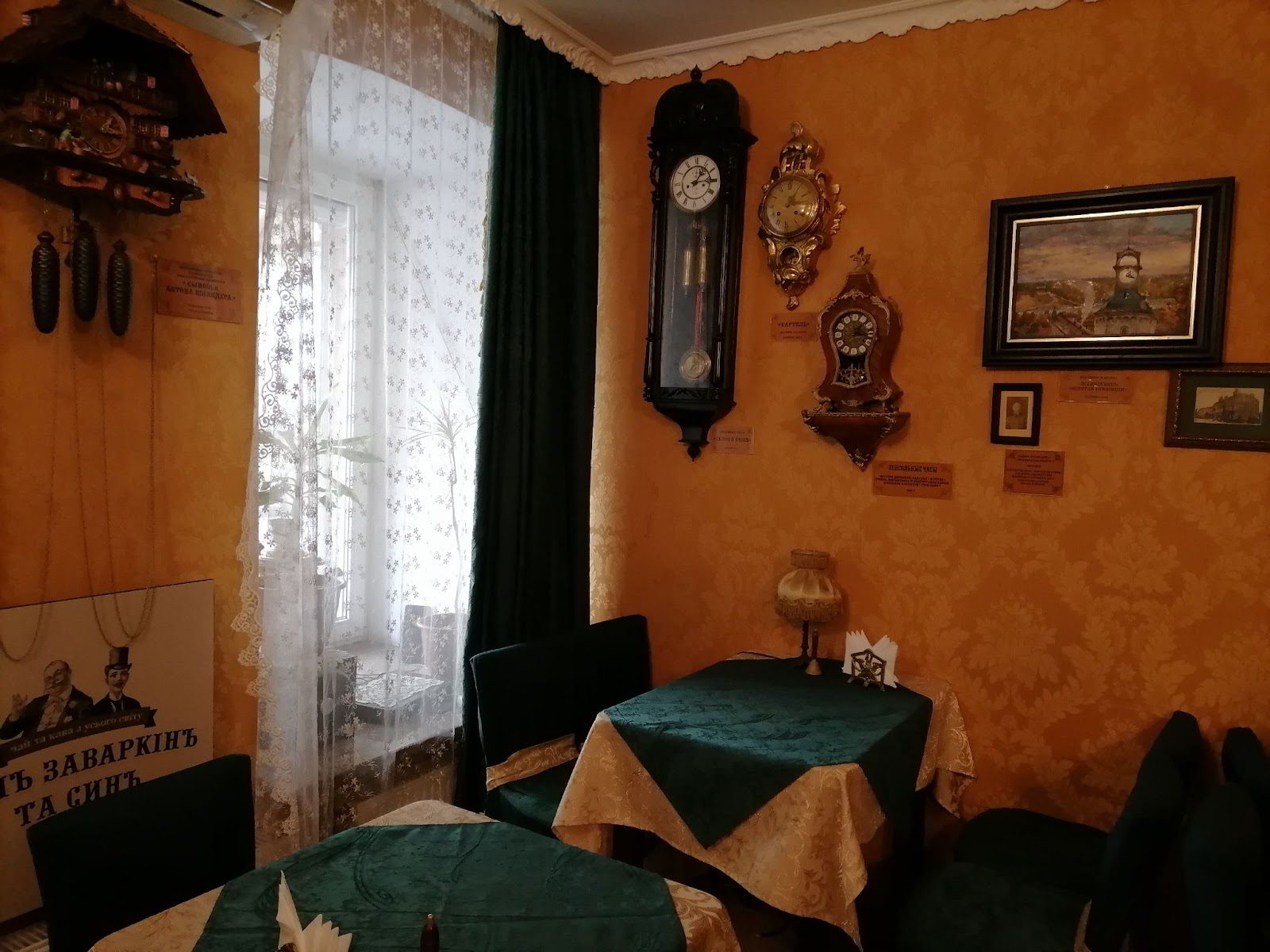 Неожиданно звуки города исчезают, и мягко окутывает тишина – с мерным тиканьем старинных часов и ароматом горячего кофе. Часы здесь повсюду. Английские, голландские, французские, немецкие. Между ними на стенах и полках монохромные фото винничан из прошлого столетия. Портрет первого владельца дома – Матвея Заваркина – тоже здесь. К слову, нынешний хозяин кофейни удивительно похож на него.
