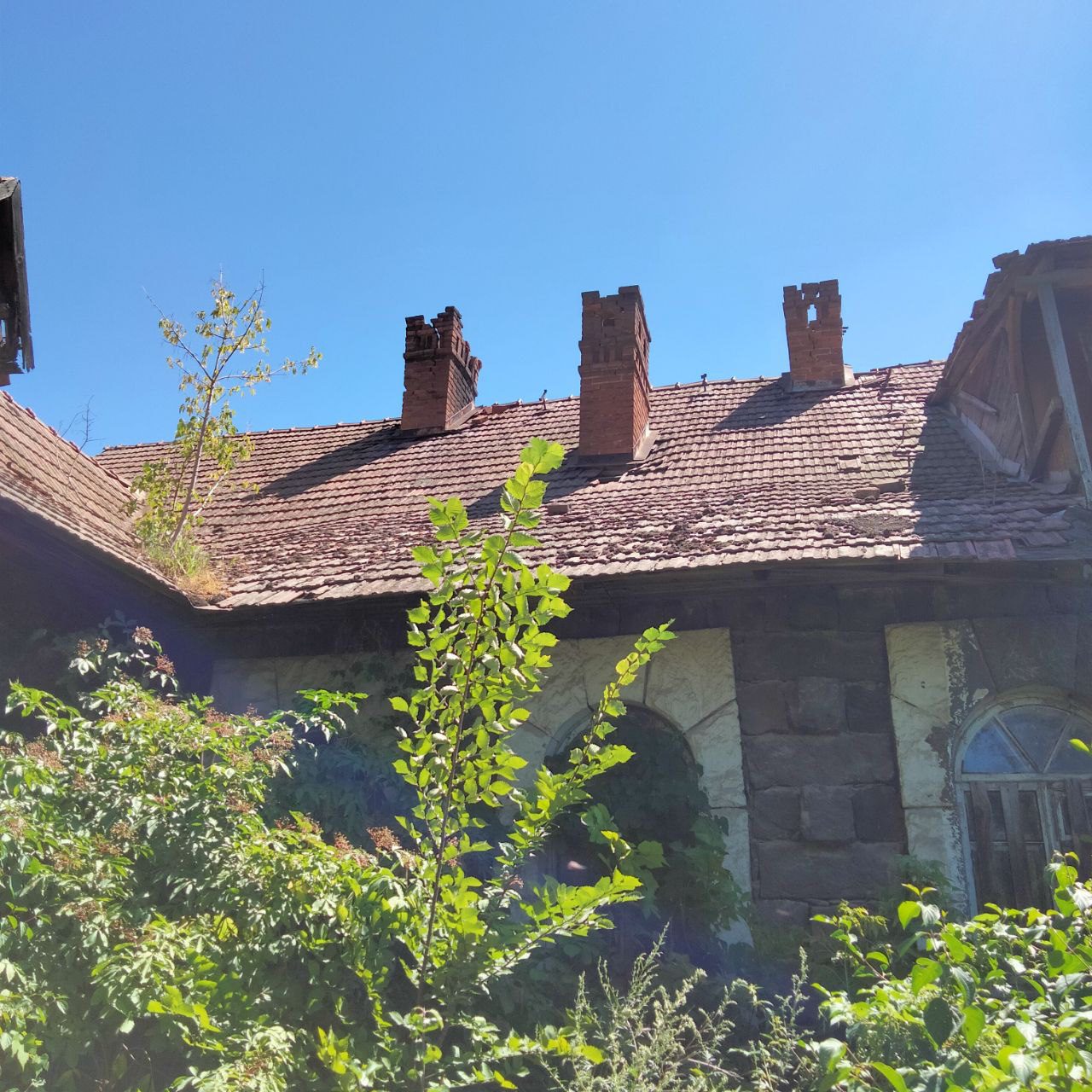 Дах дуже складної форми, що серед теслярів називають “ластівчин хвіст”. Черепиця, якою вкритий будинок, привезена з Європи, до речі, цією ж черепицею вкриті ще декілька будинків, що знаходяться неподалік нашого головного героя. Комини на даху створені в стилі бароко. Не зважаючи на те, що будинок великий, має вісім різних за розміром кімнат, опалення створено спеціально для того, щоб було взимку завжди тепло. Ще цікавою особливістю стін даного приміщення є те, що в середину, між каменем зовні та цеглою в середині, ставили прошарок 10 см коркового дерева. Така техніка допомагала зберігати тепло в зимку та прохолоду в літку. Доречі коркові дерева були завезені спеціально з Португалії та висаджені великим лісом біля сучасної школи, на сьогоднішній час збереглися десять представників.
